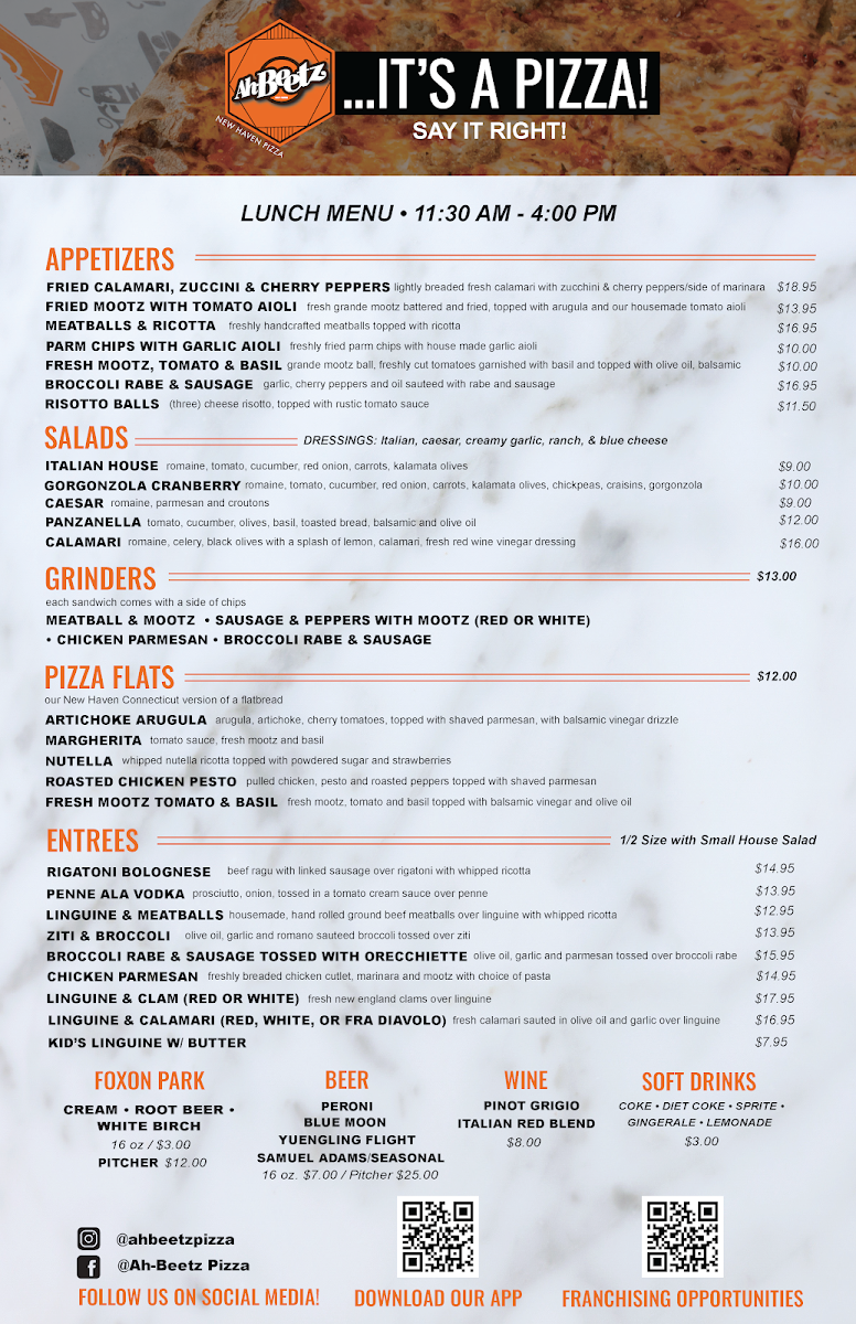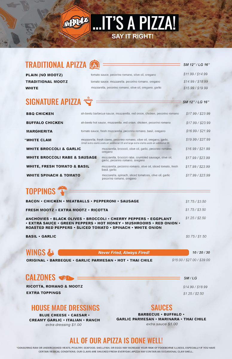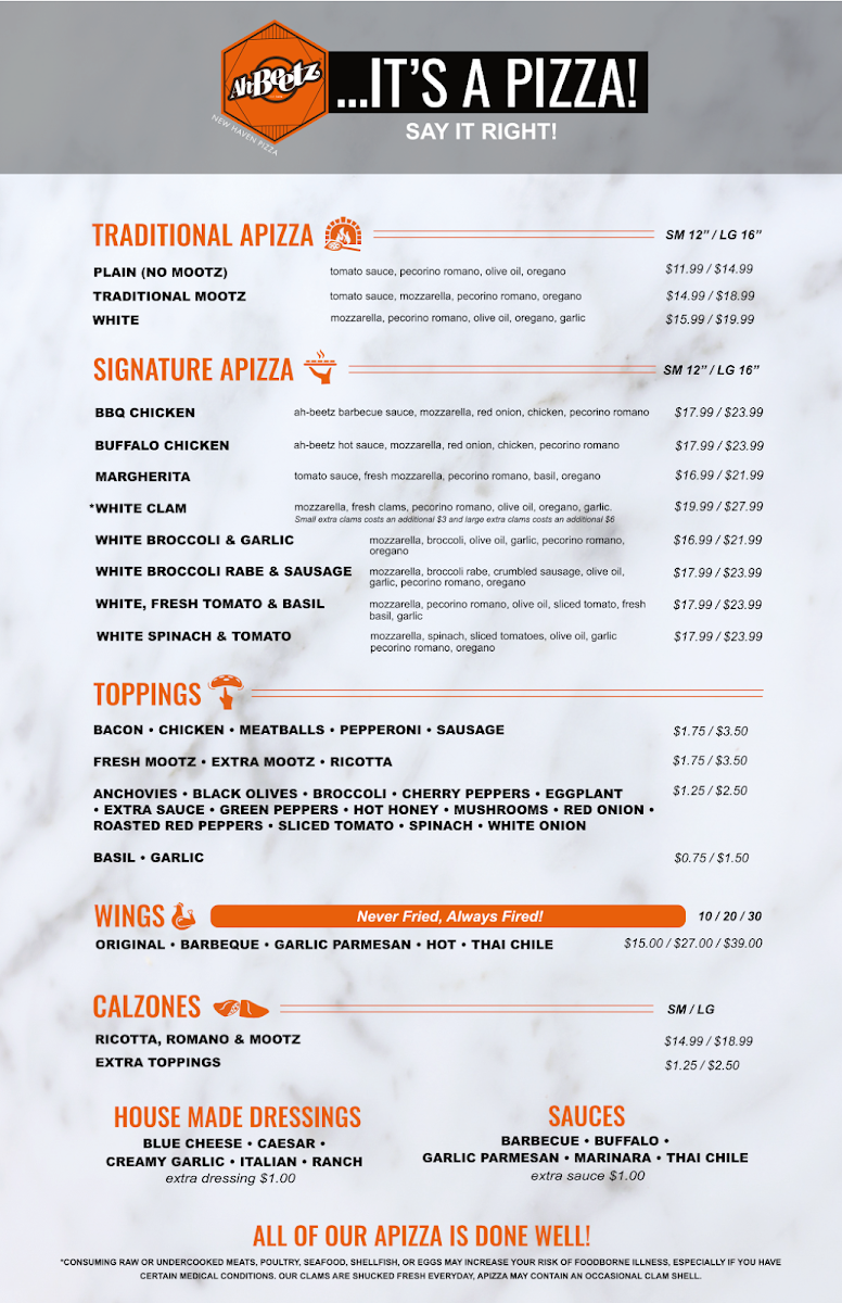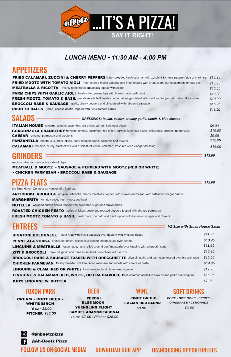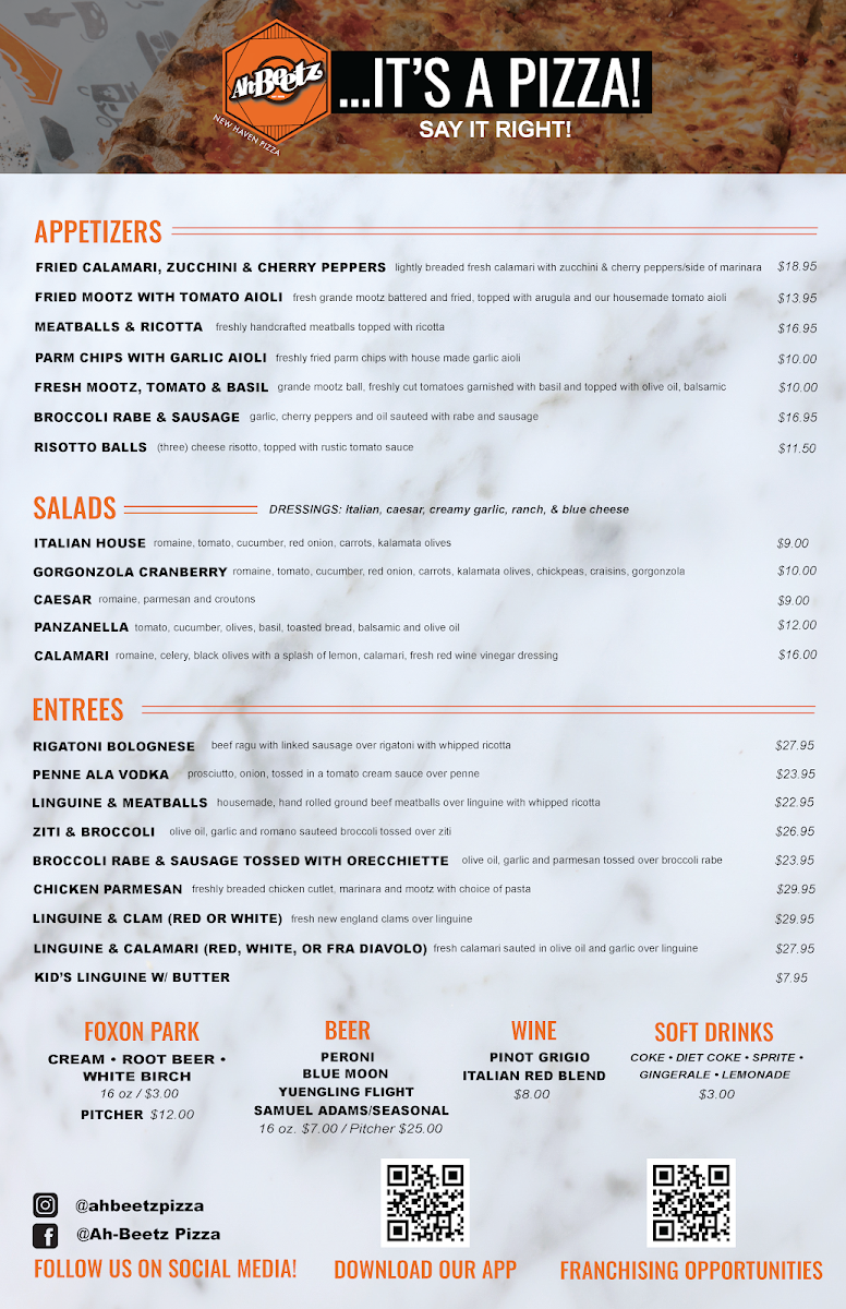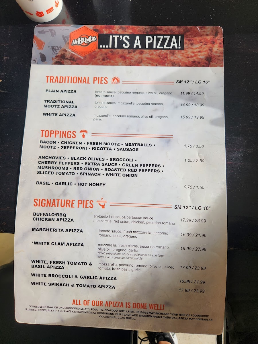 Ah-Beetz specializes in crafting large, mouthwatering pies that are cooked to perfection. Their 16" Margherita Pizza is a classic masterpiece—a symphony of rich tomato sauce, fresh mozzarella, and fragrant basil that transports you straight to an Italian trattoria. For seafood lovers, the 16" White Clam Pizza is a must-try; each bite is loaded with succulent, shucked fresh clams mingling with garlic and pecorino Romano, delivering an ocean-fresh flavor that is both unique and refreshing. If you're in the mood for something different, the 16" White, Fresh Tomato & Basil Pizza drapes itself in mozzarella and fresh basil, creating a vibrant, herbaceous experience that is simple yet sublime.
