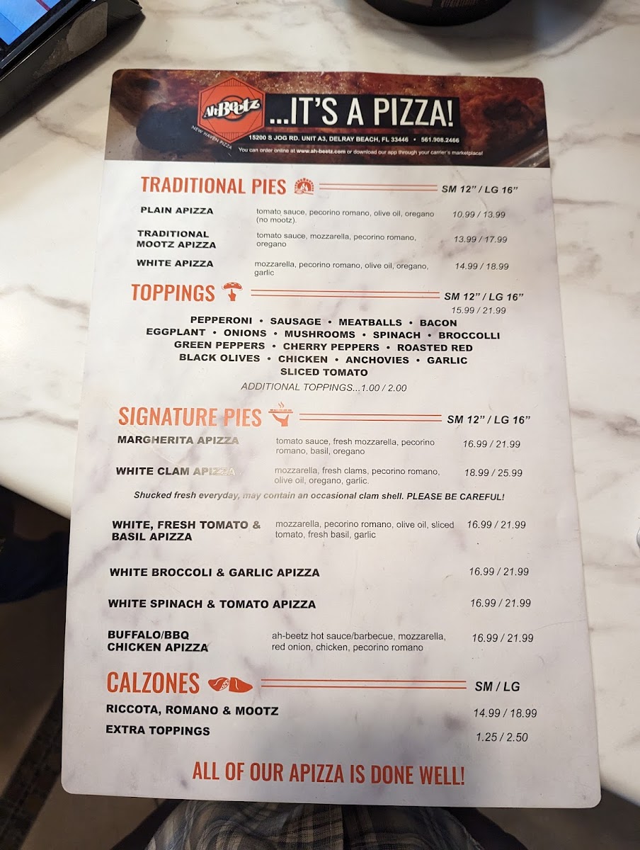 Whether you’re a seasoned pizza connoisseur or someone simply looking for a satisfying meal, Ah-Beetz embodies the essence of authentic pizza right in the heart of Delray Beach. It’s an experience wrapped in flavor and topped with friendliness, making it a true local gem. So grab a slice, indulge in the comfort of home-cooked favorites, and let Ah-Beetz redefine your pizza experience in Florida.